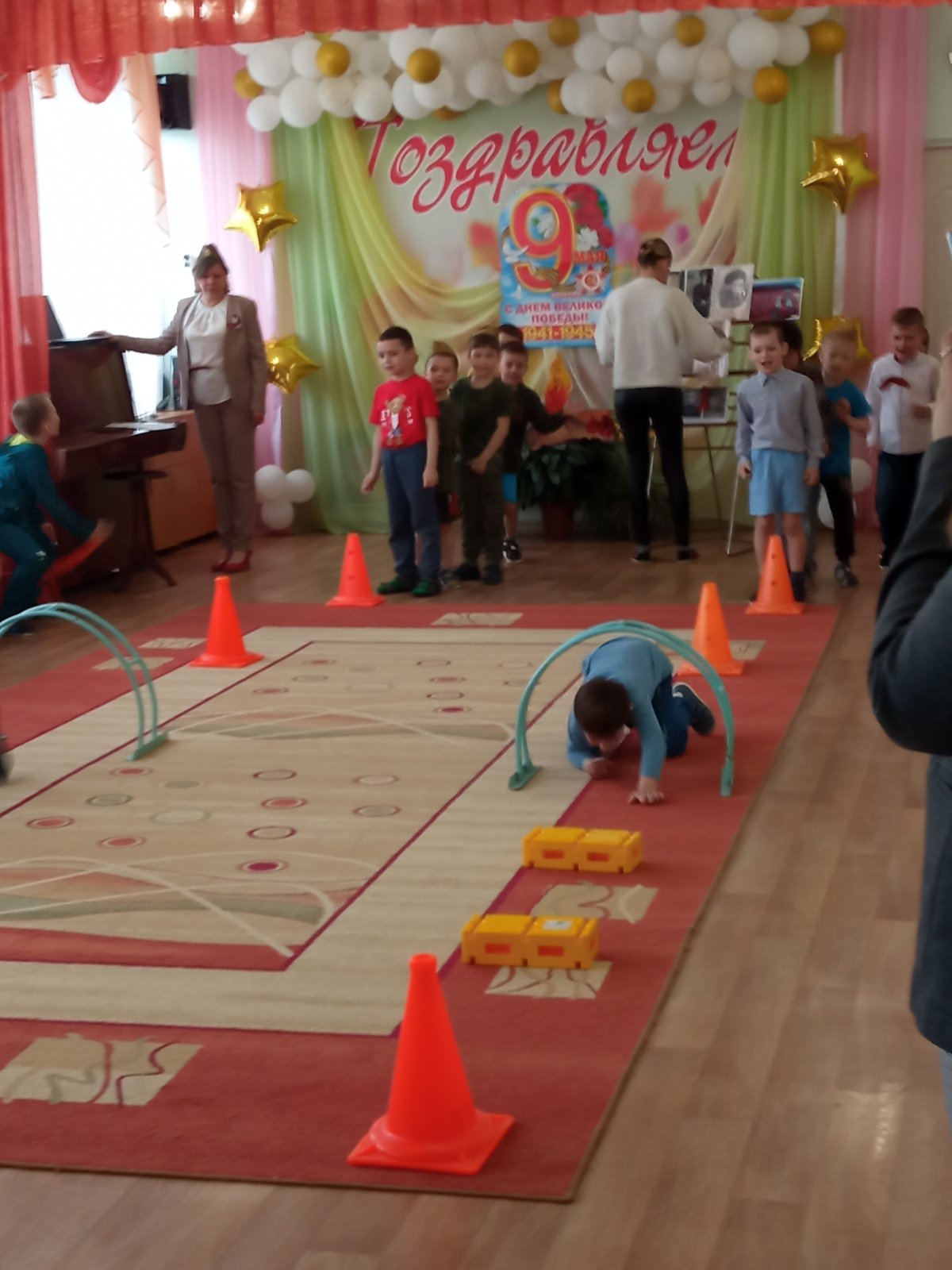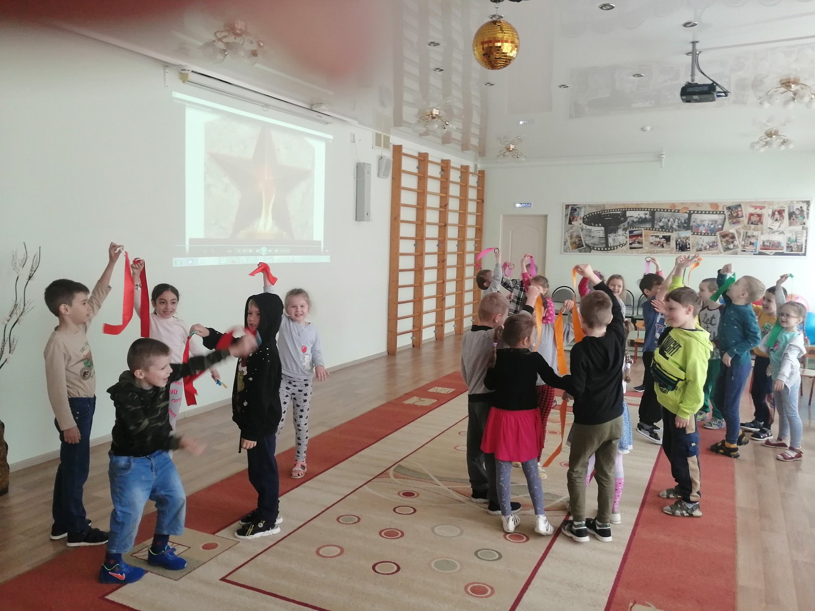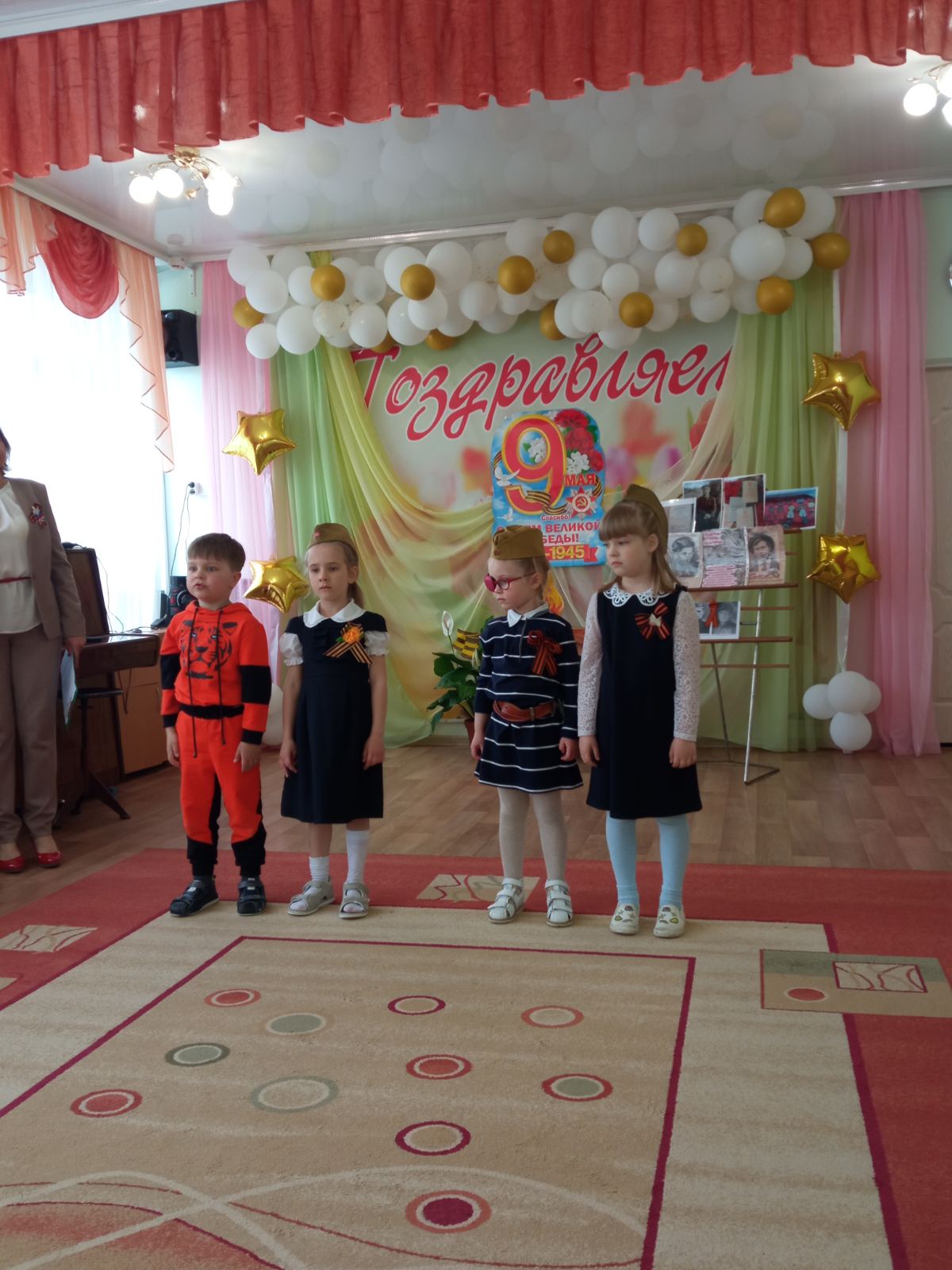 Торжественные мероприятия, подготовленные музыкальными руководителями Бариновой Т.В. и Комлевой С.И. и воспитателями подготовительной и старших групп детского сада, прошли в тёплой обстановке. Дети пели песни, читали стихотворения, танцевали. Так же все сотрудники ДОУ и воспитанники почтили память погибших в ВОВ минутой молчания. Праздник закончился весёлой игрой «Салют» в честь Дня Победы.