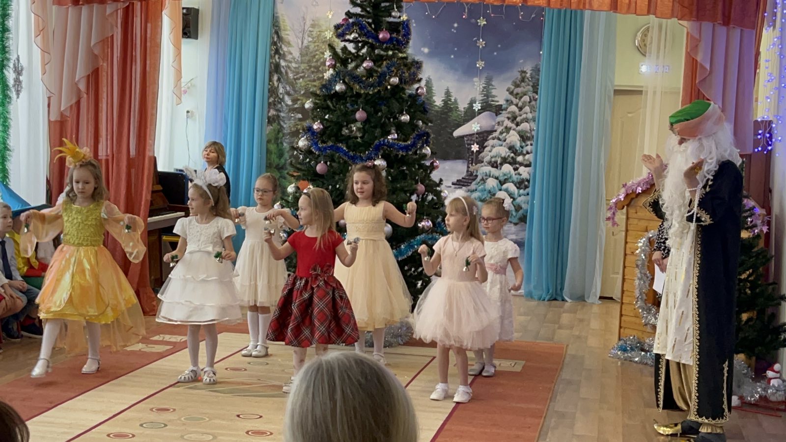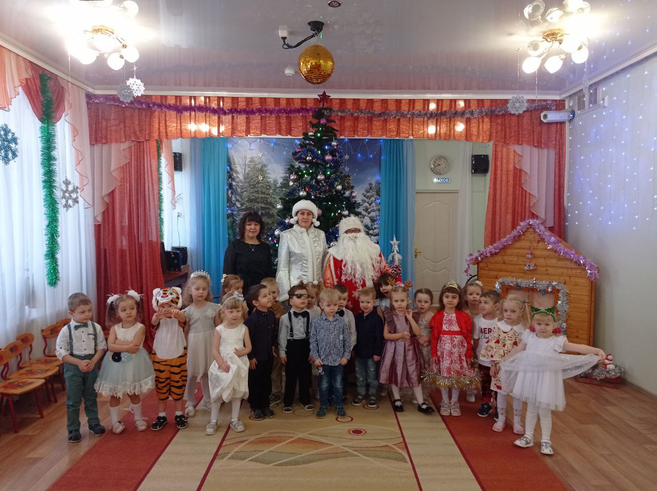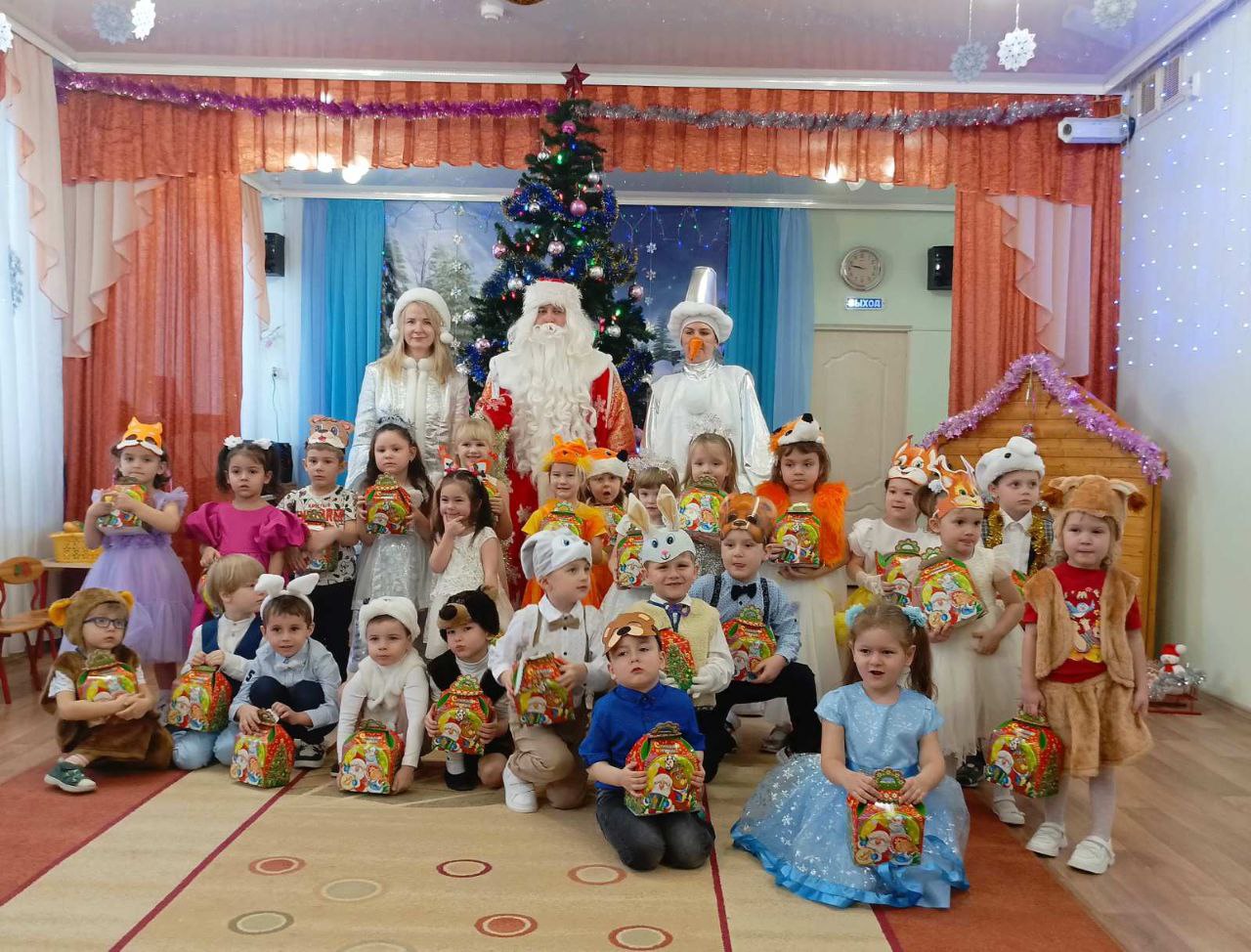 С 22 по 28 декабря в нашем детском саду были проведены новогодние утренники во всех возрастных группах. Сказочно украшенный музыкальный зал, сверкающие огоньки, нарядная ёлка, увлекательные танцы и хороводы, стихи, загадки, веселые игры подарили ребятам и их родителям праздничное новогоднее настроение. Восторженные эмоции переполняли всех присутствующих в зале – и детей, и гостей. Ребята были в восторге от неожиданных новогодних сюрпризов и встреч со сказочными героями.